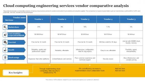 This slide showcases a comparative analysis of various cloud service vendors to analyse and select most suitable and valuable supplier. The comparison is based on parameters such as market share, cost month for 1vCPU and 2GB RAM, free trial, benefits and disadvantages. Pitch your topic with ease and precision using this Cloud Computing Engineering Services Vendor Comparative Analysis Inspiration Pdf This layout presents information on Market Share, Benefit, Disadvantage, Free Trial It is also available for immediate download and adjustment. So, changes can be made in the color, design, graphics or any other component to create a unique layout. This slide showcases a comparative analysis of various cloud service vendors to analyse and select most suitable and valuable supplier. The comparison is based on parameters such as market share, cost month for 1vCPU and 2GB RAM, free trial, benefits and disadvantages.