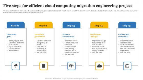 The purpose of this slide is to showcase stages to successfully carry out cloud migration project to move IT servers and software to remote servers. It includes steps such as knowing the goal, introducing governance, preparing environment, implementing devOps and understanding cost model. Showcasing this set of slides titled Five Steps For Efficient Cloud Computing Migration Engineering Project Designs Pdf The topics addressed in these templates are Determine Goal, Introduce Governance, Prepare Environment All the content presented in this PPT design is completely editable. Download it and make adjustments in color, background, font etc. as per your unique business setting. The purpose of this slide is to showcase stages to successfully carry out cloud migration project to move IT servers and software to remote servers. It includes steps such as knowing the goal, introducing governance, preparing environment, implementing devOps and understanding cost model.