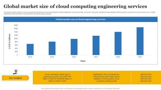 The purpose of this slide is to showcase global market size of cloud computing to indicate potential for new businesses or services. It includes a graphical representation of future global market size of cloud services, key insights regarding CAGR and factors responsible for cloud technologys growth. Pitch your topic with ease and precision using this Global Market Size Of Cloud Computing Engineering Services Slides Pdf This layout presents information on Global Market Size, Cloud Computing, Engineering Services It is also available for immediate download and adjustment. So, changes can be made in the color, design, graphics or any other component to create a unique layout. The purpose of this slide is to showcase global market size of cloud computing to indicate potential for new businesses or services. It includes a graphical representation of future global market size of cloud services, key insights regarding CAGR and factors responsible for cloud technologys growth.