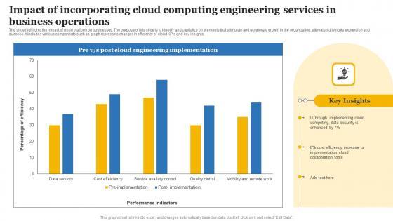 The slide highlights the impact of cloud platform on businesses. The purpose of this slide is to identify and capitalize on elements that stimulate and accelerate growth in the organization, ultimately driving its expansion and success. It includes various components such as graph represents changes in efficiency of cloud KPIs and key insights. Pitch your topic with ease and precision using this Impact Of Incorporating Cloud Computing Engineering Services In Business Operations Slides Pdf This layout presents information on Cloud Engineering Implementation, Business Operations It is also available for immediate download and adjustment. So, changes can be made in the color, design, graphics or any other component to create a unique layout. The slide highlights the impact of cloud platform on businesses. The purpose of this slide is to identify and capitalize on elements that stimulate and accelerate growth in the organization, ultimately driving its expansion and success. It includes various components such as graph represents changes in efficiency of cloud KPIs and key insights.