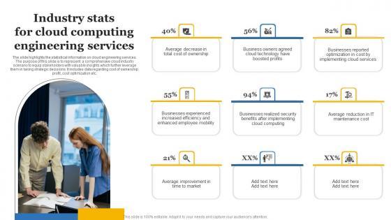 The slide highlights the statistical information on cloud engineering services. The purpose of this slide is to represent a comprehensive cloud industry scenario to equip stakeholders with valuable insights which further leverage them in taking strategic decisions. It includes data regarding cost of ownership, profit, cost optimization etc. Showcasing this set of slides titled Industry Stats For Cloud Computing Engineering Services Demonstration Pdf The topics addressed in these templates are Cost Of Ownership, Business, Technology, Cloud Computing All the content presented in this PPT design is completely editable. Download it and make adjustments in color, background, font etc. as per your unique business setting. The slide highlights the statistical information on cloud engineering services. The purpose of this slide is to represent a comprehensive cloud industry scenario to equip stakeholders with valuable insights which further leverage them in taking strategic decisions. It includes data regarding cost of ownership, profit, cost optimization etc.