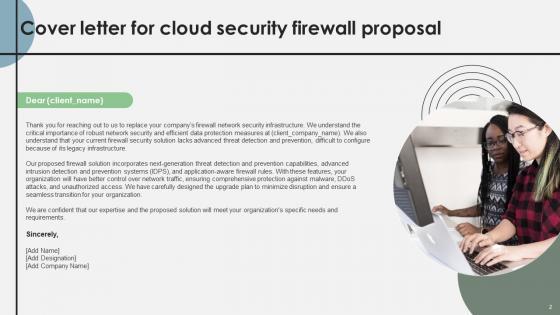 Take your presentations to the next level with our Cover Letter For Cloud Security Firewall Proposal template. With its sleek design and seamless editing features, this single-slide PPT template is a game-changer for professionals who want to make an impact. Impress your audience with stunning visuals and engaging content that will capture their attention from start to finish. Get your hands on our template and elevate your presentations to new heights. Cover Letter, Cloud Security Firewall Proposal