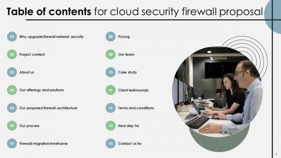 Take your presentations to the next level with our Table Of Contents For Cloud Security Firewall Proposal template. With its sleek design and seamless editing features, this single-slide PPT template is a game-changer for professionals who want to make an impact. Impress your audience with stunning visuals and engaging content that will capture their attention from start to finish. Get your hands on our template and elevate your presentations to new heights. Our Table Of Contents For Cloud Security Firewall Proposal are topically designed to provide an attractive backdrop to any subject. Use them to look like a presentation pro.