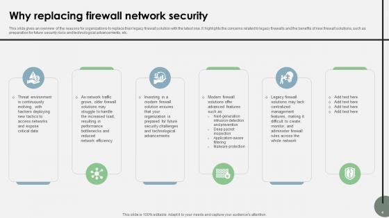 This slide gives an overview of the reasons for organizations to replace their legacy firewall solution with the latest one. It highlights the concerns related to legacy firewalls and the benefits of new firewall solutions, such as preparation for future security risks and technological advancements, etc.Stand out from the crowd with our dynamic Why Replacing Firewall Network Security Cloud Security Firewall Proposal template. Designed to help you make a statement, this single-slide PPT template is fully customizable to suit your unique needs. With eye-catching visuals and seamless editing options, you can create impactful presentations in minutes. Say goodbye to boring slides and unlock your presentation potential with our top-notch template. This slide gives an overview of the reasons for organizations to replace their legacy firewall solution with the latest one. It highlights the concerns related to legacy firewalls and the benefits of new firewall solutions, such as preparation for future security risks and technological advancements, etc.