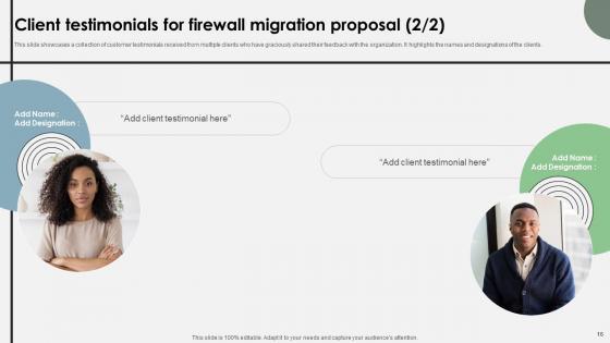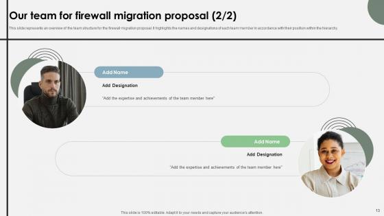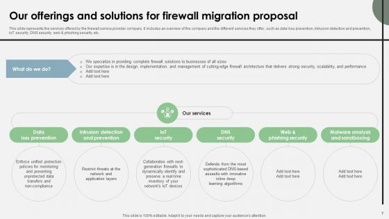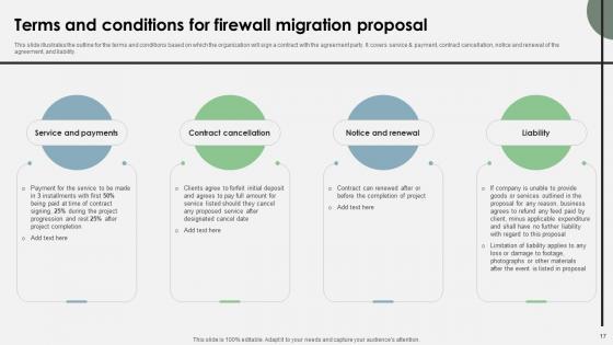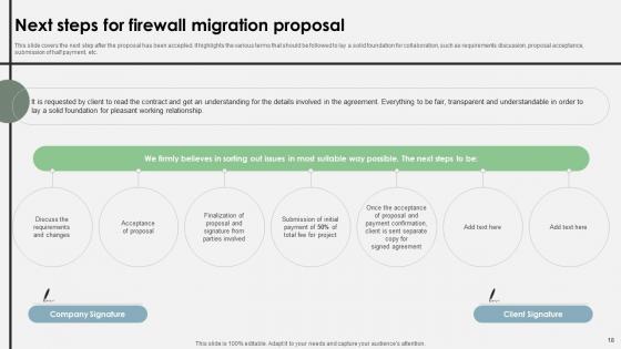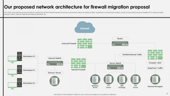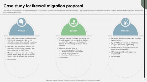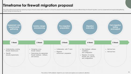 This slide outlines the process of a firewall service provider company to replace a legacy firewall solution with a new one in an organization. The process steps include assessment and requirements gathering, solution design and planning, pre-migration preparation, etc.Take your presentations to the next level with our Our Process For Migrating Firewall Network Security Cloud Security Firewall Proposal template. With its sleek design and seamless editing features, this single-slide PPT template is a game-changer for professionals who want to make an impact. Impress your audience with stunning visuals and engaging content that will capture their attention from start to finish. Get your hands on our template and elevate your presentations to new heights. This slide outlines the process of a firewall service provider company to replace a legacy firewall solution with a new one in an organization. The process steps include assessment and requirements gathering, solution design and planning, pre-migration preparation, etc.