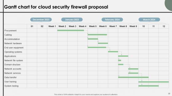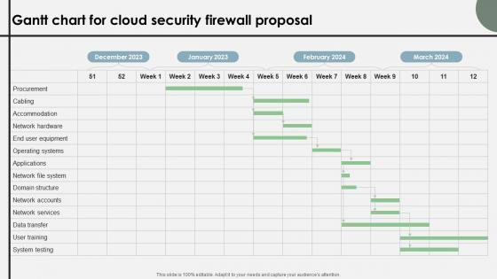 Power up your presentations with our Gantt Chart For Cloud Security Firewall Proposal single-slide PPT template. Our visually-stunning template will help you deliver your message with confidence. With easy-to-use editing options and fully customizable features, you can create polished and captivating presentations in no time. Say goodbye to boring slides and hello to impactful presentations with our top-quality template. Download now and get ready to wow your audience. singles Our Gantt Chart For Cloud Security Firewall Proposal are topically designed to provide an attractive backdrop to any subject. Use them to look like a presentation pro.