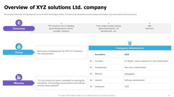 The purpose of this slide is to represent the overview of XYZ Technology company. The main slide components include company information, vision and mission of XYZ solutions Ltd. Crafting an eye-catching presentation has never been more straightforward. Let your presentation shine with this tasteful yet straightforward Overview Of XYZ Solutions Ltd Company Cloud Game Development Fundraising Pitch Deck template. It offers a minimalistic and classy look that is great for making a statement. The colors have been employed intelligently to add a bit of playfulness while still remaining professional. Construct the ideal Overview Of XYZ Solutions Ltd Company Cloud Game Development Fundraising Pitch Deck that effortlessly grabs the attention of your audience Begin now and be certain to wow your customers The purpose of this slide is to represent the overview of XYZ Technology company. The main slide components include company information, vision and mission of XYZ solutions Ltd.