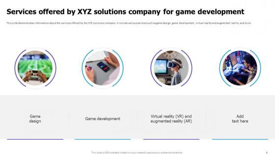 This slide demonstrates information about the services offered by the XYZ solutions company. It include various services such as game design, game development, virtual reality and augmented reality, and so on. Formulating a presentation can take up a lot of effort and time, so the content and message should always be the primary focus. The visuals of the PowerPoint can enhance the presenters message, so our Services Offered By XYZ Solutions Company For Game Development Cloud Game Development Fundraising was created to help save time. Instead of worrying about the design, the presenter can concentrate on the message while our designers work on creating the ideal templates for whatever situation is needed. Slidegeeks has experts for everything from amazing designs to valuable content, we have put everything into Services Offered By XYZ Solutions Company For Game Development Cloud Game Development Fundraising. This slide demonstrates information about the services offered by the XYZ solutions company. It include various services such as game design, game development, virtual reality and augmented reality, and so on.