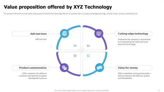 The purpose of this slide is to outline the value proposition that the XYZ Technology offers to its customer base. It includes cutting-edge technology, value for money, product customization, etc. Welcome to our selection of the Value Proposition Offered By XYZ Technology Cloud Game Development Fundraising Pitch Deck. These are designed to help you showcase your creativity and bring your sphere to life. Planning and Innovation are essential for any business that is just starting out. This collection contains the designs that you need for your everyday presentations. All of our PowerPoints are 100Percent editable, so you can customize them to suit your needs. This multi-purpose template can be used in various situations. Grab these presentation templates today. The purpose of this slide is to outline the value proposition that the XYZ Technology offers to its customer base. It includes cutting-edge technology, value for money, product customization, etc.
