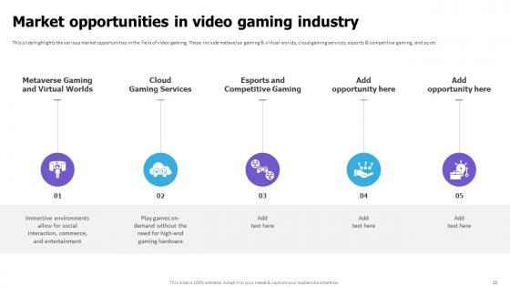 This slide highlights the various market opportunities in the field of video gaming. These include metaverse gaming and virtual worlds, cloud gaming services, esports and competitive gaming, and so on. If your project calls for a presentation, then Slidegeeks is your go-to partner because we have professionally designed, easy-to-edit templates that are perfect for any presentation. After downloading, you can easily edit Market Opportunities In Video Gaming Industry Cloud Game Development Fundraising Pitch Deck and make the changes accordingly. You can rearrange slides or fill them with different images. Check out all the handy templates This slide highlights the various market opportunities in the field of video gaming. These include metaverse gaming and virtual worlds, cloud gaming services, esports and competitive gaming, and so on.
