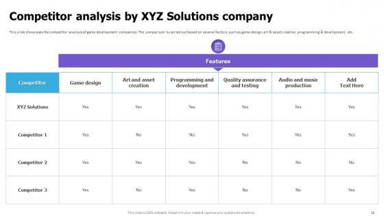 This slide showcases the competitor analysis of game development companies. The comparison is carried out based on several factors, such as game design, art and asset creation, programming and development, etc. Create an editable Competitor Analysis By XYZ Solutions Company Cloud Game Development Fundraising Pitch Deck that communicates your idea and engages your audience. Whether you are presenting a business or an educational presentation, pre-designed presentation templates help save time. Competitor Analysis By XYZ Solutions Company Cloud Game Development Fundraising Pitch Deck is highly customizable and very easy to edit, covering many different styles from creative to business presentations. Slidegeeks has creative team members who have crafted amazing templates. So, go and get them without any delay. This slide showcases the competitor analysis of game development companies. The comparison is carried out based on several factors, such as game design, art and asset creation, programming and development, etc.