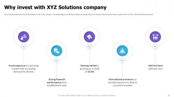 This slide discusses why should businesses invest in the company. The advantages provided by company are great exposure, strong financial performance, supply chain control, international presence, etc. The Why Invest With XYZ Solutions Company Cloud Game Development Fundraising Pitch Deck is a compilation of the most recent design trends as a series of slides. It is suitable for any subject or industry presentation, containing attractive visuals and photo spots for businesses to clearly express their messages. This template contains a variety of slides for the user to input data, such as structures to contrast two elements, bullet points, and slides for written information. Slidegeeks is prepared to create an impression. This slide discusses why should businesses invest in the company. The advantages provided by company are great exposure, strong financial performance, supply chain control, international presence, etc.