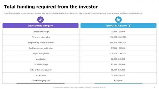 This slide represents the various investment categories. These are concept design, asset creation, development, quality assurance, project management, monetization, user interface design, and many more. This Total Funding Required From The Investor Cloud Game Development Fundraising Pitch Deck is perfect for any presentation, be it in front of clients or colleagues. It is a versatile and stylish solution for organizing your meetings. The Total Funding Required From The Investor Cloud Game Development Fundraising Pitch Deck features a modern design for your presentation meetings. The adjustable and customizable slides provide unlimited possibilities for acing up your presentation. Slidegeeks has done all the homework before launching the product for you. So, do not wait, grab the presentation templates today This slide represents the various investment categories. These are concept design, asset creation, development, quality assurance, project management, monetization, user interface design, and many more.