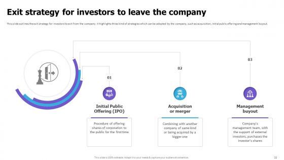 This slide outlines the exit strategy for investors to exit from the company. It highlights three kind of strategies which can be adopted by the company, such as acquisition, initial public offering and management buyout. There are so many reasons you need a Exit Strategy For Investors To Leave The Company Cloud Game Development Fundraising Pitch Deck. The first reason is you can not spend time making everything from scratch, Thus, Slidegeeks has made presentation templates for you too. You can easily download these templates from our website easily. This slide outlines the exit strategy for investors to exit from the company. It highlights three kind of strategies which can be adopted by the company, such as acquisition, initial public offering and management buyout.