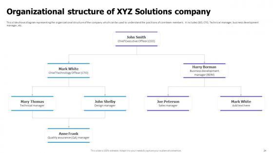 This slide shows diagram representing the organizational structure of the company which can be used to understand the positions of core team members. It includes CEO, CTO, Technical manager, business development manager, etc. Are you in need of a template that can accommodate all of your creative concepts This one is crafted professionally and can be altered to fit any style. Use it with Google Slides or PowerPoint. Include striking photographs, symbols, depictions, and other visuals. Fill, move around, or remove text boxes as desired. Test out color palettes and font mixtures. Edit and save your work, or work with colleagues. Download Organizational Structure Of XYZ Solutions Company Cloud Game Development Fundraising Pitch Deck and observe how to make your presentation outstanding. Give an impeccable presentation to your group and make your presentation unforgettable. This slide shows diagram representing the organizational structure of the company which can be used to understand the positions of core team members. It includes CEO, CTO, Technical manager, business development manager, etc.