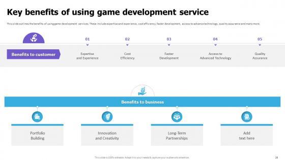 This slide outlines the benefits of using game development services. These include expertise and experience, cost efficiency, faster development, access to advance technology, quality assurance and many more. Do you have an important presentation coming up Are you looking for something that will make your presentation stand out from the rest Look no further than Key Benefits Of Using Game Development Service Cloud Game Development Fundraising Pitch Deck. With our professional designs, you can trust that your presentation will pop and make delivering it a smooth process. And with Slidegeeks, you can trust that your presentation will be unique and memorable. So why wait Grab Key Benefits Of Using Game Development Service Cloud Game Development Fundraising Pitch Deck today and make your presentation stand out from the rest This slide outlines the benefits of using game development services. These include expertise and experience, cost efficiency, faster development, access to advance technology, quality assurance and many more.