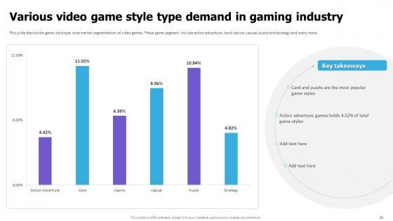 This slide depicts the game style type wise market segmentation of video games. These game segment include action adventure, card, casino, casual, puzzle and strategy and many more. Explore a selection of the finest Various Video Game Style Type Demand In Gaming Industry Cloud Game Development Fundraising here. With a plethora of professionally designed and pre-made slide templates, you can quickly and easily find the right one for your upcoming presentation. You can use our Various Video Game Style Type Demand In Gaming Industry Cloud Game Development Fundraising to effectively convey your message to a wider audience. Slidegeeks has done a lot of research before preparing these presentation templates. The content can be personalized and the slides are highly editable. Grab templates today from Slidegeeks. This slide depicts the game style type wise market segmentation of video games. These game segment include action adventure, card, casino, casual, puzzle and strategy and many more.
