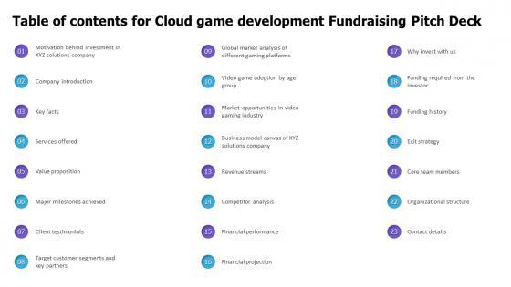 Coming up with a presentation necessitates that the majority of the effort goes into the content and the message you intend to convey. The visuals of a PowerPoint presentation can only be effective if it supplements and supports the story that is being told. Keeping this in mind our experts created Table Of Contents For Cloud Game Development Fundraising Pitch Deck to reduce the time that goes into designing the presentation. This way, you can concentrate on the message while our designers take care of providing you with the right template for the situation. Our Table Of Contents For Cloud Game Development Fundraising Pitch Deck are topically designed to provide an attractive backdrop to any subject. Use them to look like a presentation pro.