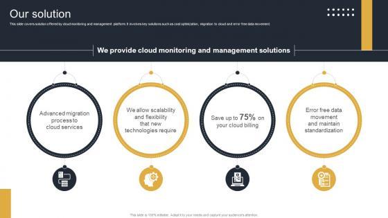 This slide covers solution offered by cloud monitoring and management platform. It involves key solutions such as cost optimization, migration to cloud and error free data movement. Make sure to capture your audiences attention in your business displays with our gratis customizable Our Solution Cloud Monitoring And Management Pitch Deck. These are great for business strategies, office conferences, capital raising or task suggestions. If you desire to acquire more customers for your tech business and ensure they stay satisfied, create your own sales presentation with these plain slides. This slide covers solution offered by cloud monitoring and management platform. It involves key solutions such as cost optimization, migration to cloud and error free data movement.