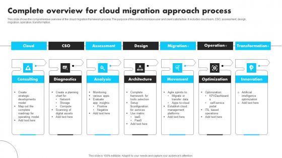 This slide shows the comprehensive overview of the cloud migration framework process. The purpose of this slide to increase user and client satisfaction. It includes cloud team, CSO, assessment, design, migration, operation, transformation. Pitch your topic with ease and precision using this Complete Overview For Cloud Migration Approach Process Graphics Pdf This layout presents information on Consulting, Diagnostics, Analysis, Architecture It is also available for immediate download and adjustment. So, changes can be made in the color, design, graphics or any other component to create a unique layout. This slide shows the comprehensive overview of the cloud migration framework process. The purpose of this slide to increase user and client satisfaction. It includes cloud team, CSO, assessment, design, migration, operation, transformation.