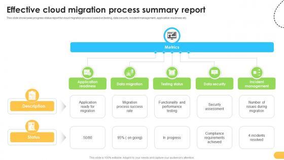 This slide showcases progress status report for cloud migration process based on testing, data security, incident management, application readiness etc. Are you in need of a template that can accommodate all of your creative concepts This one is crafted professionally and can be altered to fit any style. Use it with Google Slides or PowerPoint. Include striking photographs, symbols, depictions, and other visuals. Fill, move around, or remove text boxes as desired. Test out color palettes and font mixtures. Edit and save your work, or work with colleagues. Download Effective Cloud Migration Process Summary Report Data Migration From On Premises and observe how to make your presentation outstanding. Give an impeccable presentation to your group and make your presentation unforgettable. This slide showcases progress status report for cloud migration process based on testing, data security, incident management, application readiness etc.