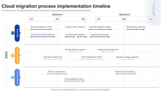 This slide showcases cloud migration process execution roadmap which includes planning, infrastructure and implementation phases. Slidegeeks is here to make your presentations a breeze with Effective Data Migration Cloud Migration Process Implementation Timeline With our easy-to-use and customizable templates, you can focus on delivering your ideas rather than worrying about formatting. With a variety of designs to choose from, you are sure to find one that suits your needs. And with animations and unique photos, illustrations, and fonts, you can make your presentation pop. So whether you are giving a sales pitch or presenting to the board, make sure to check out Slidegeeks first This slide showcases cloud migration process execution roadmap which includes planning, infrastructure and implementation phases.