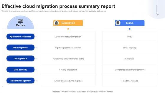 This slide showcases progress status report for cloud migration process based on testing, data security, incident management, application readiness etc. Are you in need of a template that can accommodate all of your creative concepts This one is crafted professionally and can be altered to fit any style. Use it with Google Slides or PowerPoint. Include striking photographs, symbols, depictions, and other visuals. Fill, move around, or remove text boxes as desired. Test out color palettes and font mixtures. Edit and save your work, or work with colleagues. Download Effective Data Migration Effective Cloud Migration Process Summary Report and observe how to make your presentation outstanding. Give an impeccable presentation to your group and make your presentation unforgettable. This slide showcases progress status report for cloud migration process based on testing, data security, incident management, application readiness etc.