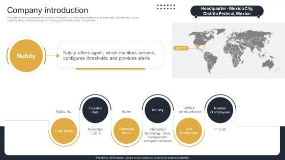 This slide covers cloud management solution information. It involves basic details such as legal name, founded date, current operating status, oriented industry, last funding type and total number of employee. Slidegeeks is one of the best resources for PowerPoint templates. You can download easily and regulate Company Introduction Cloud Monitoring And Management Pitch Deck for your personal presentations from our wonderful collection. A few clicks is all it takes to discover and get the most relevant and appropriate templates. Use our Templates to add a unique zing and appeal to your presentation and meetings. All the slides are easy to edit and you can use them even for advertisement purposes. This slide covers cloud management solution information. It involves basic details such as legal name, founded date, current operating status, oriented industry, last funding type and total number of employee.