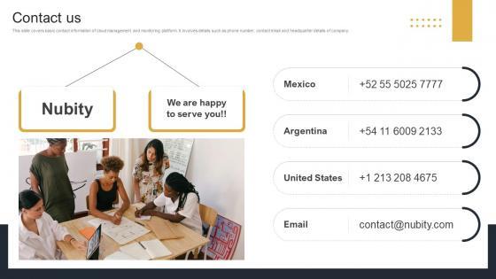 This slide covers basic contact information of cloud management and monitoring platform. It involves details such as phone number, contact email and headquarter details of company. There are so many reasons you need a Contact Us Cloud Monitoring And Management Pitch Deck. The first reason is you can not spend time making everything from scratch, Thus, Slidegeeks has made presentation templates for you too. You can easily download these templates from our website easily. This slide covers basic contact information of cloud management and monitoring platform. It involves details such as phone number, contact email and headquarter details of company.