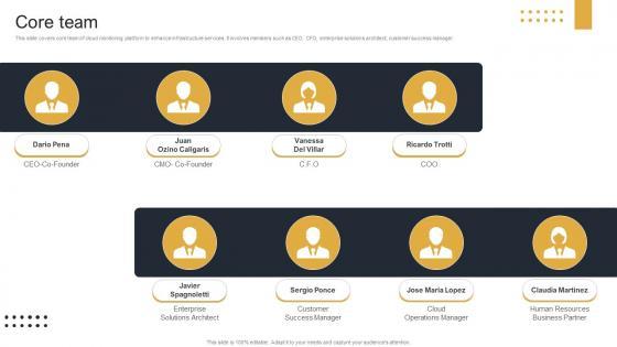 This slide covers core team of cloud monitoring platform to enhance infrastructure services. It involves members such as CEO, CFO, enterprise solutions architect, customer success manager. Do you have to make sure that everyone on your team knows about any specific topic I yes, then you should give Core Team Cloud Monitoring And Management Pitch Deck a try. Our experts have put a lot of knowledge and effort into creating this impeccable Core Team Cloud Monitoring And Management Pitch Deck. You can use this template for your upcoming presentations, as the slides are perfect to represent even the tiniest detail. You can download these templates from the Slidegeeks website and these are easy to edit. So grab these today This slide covers core team of cloud monitoring platform to enhance infrastructure services. It involves members such as CEO, CFO, enterprise solutions architect, customer success manager.