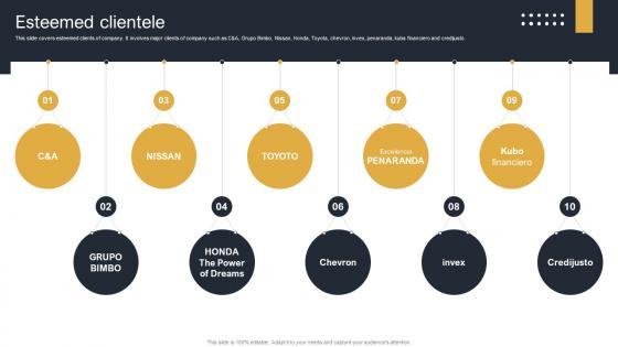 This slide covers esteemed clients of company. It involves major clients of company such as CandA, Grupo Bimbo, Nissan, Honda, Toyota, chevron, invex, penaranda, kuba financiero and credijusto. Get a simple yet stunning designed Esteemed Clientele Cloud Monitoring And Management Pitch Deck. It is the best one to establish the tone in your meetings. It is an excellent way to make your presentations highly effective. So, download this PPT today from Slidegeeks and see the positive impacts. Our easy-to-edit Esteemed Clientele Cloud Monitoring And Management Pitch Deck can be your go-to option for all upcoming conferences and meetings. So, what are you waiting for Grab this template today. This slide covers esteemed clients of company. It involves major clients of company such as CandA, Grupo Bimbo, Nissan, Honda, Toyota, chevron, invex, penaranda, kuba financiero and credijusto.