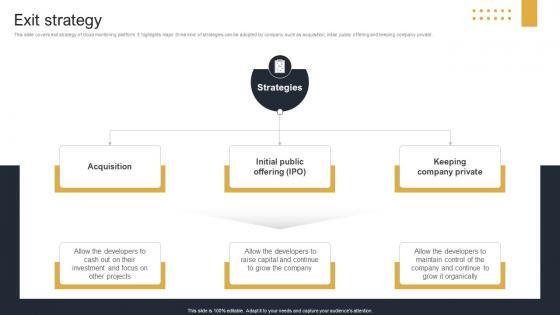 This slide covers exit strategy of cloud monitoring platform. It highlights major three kind of strategies can be adopted by company such as acquisition, initial public offering and keeping company private. From laying roadmaps to briefing everything in detail, our templates are perfect for you. You can set the stage with your presentation slides. All you have to do is download these easy-to-edit and customizable templates. Exit Strategy Cloud Monitoring And Management Pitch Deck will help you deliver an outstanding performance that everyone would remember and praise you for. Do download this presentation today. This slide covers exit strategy of cloud monitoring platform. It highlights major three kind of strategies can be adopted by company such as acquisition, initial public offering and keeping company private.