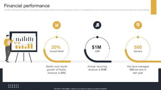 This slide covers financial performance of cloud management and monitoring platform for investor funding elevator pitch deck. It involves details such as month over month growth, annual recurring revenue and total number of servers managed. Present like a pro with Financial Performance Cloud Monitoring And Management Pitch Deck. Create beautiful presentations together with your team, using our easy-to-use presentation slides. Share your ideas in real-time and make changes on the fly by downloading our templates. So whether you are in the office, on the go, or in a remote location, you can stay in sync with your team and present your ideas with confidence. With Slidegeeks presentation got a whole lot easier. Grab these presentations today. This slide covers financial performance of cloud management and monitoring platform for investor funding elevator pitch deck. It involves details such as month over month growth, annual recurring revenue and total number of servers managed.