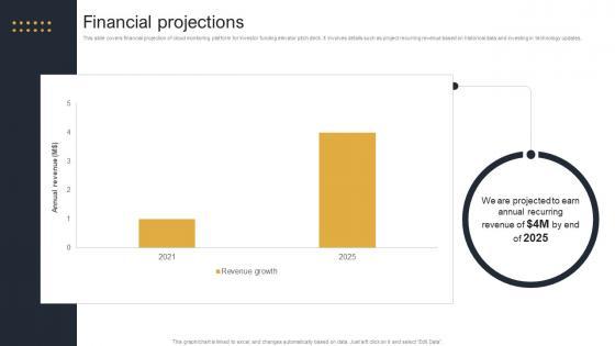 This slide covers financial projection of cloud monitoring platform for investor funding elevator pitch deck. It involves details such as project recurring revenue based on historical data and investing in technology updates. Slidegeeks is here to make your presentations a breeze with Financial Projections Cloud Monitoring And Management Pitch Deck With our easy-to-use and customizable templates, you can focus on delivering your ideas rather than worrying about formatting. With a variety of designs to choose from, you are sure to find one that suits your needs. And with animations and unique photos, illustrations, and fonts, you can make your presentation pop. So whether you are giving a sales pitch or presenting to the board, make sure to check out Slidegeeks first This slide covers financial projection of cloud monitoring platform for investor funding elevator pitch deck. It involves details such as project recurring revenue based on historical data and investing in technology updates.