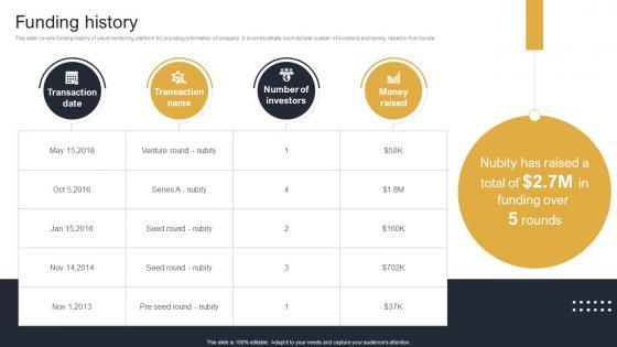 This slide covers funding history of cloud monitoring platform for providing information of company. It involves details such as total number of investors and money raised in five rounds. Do you have an important presentation coming up Are you looking for something that will make your presentation stand out from the rest Look no further than Funding History Cloud Monitoring And Management Pitch Deck. With our professional designs, you can trust that your presentation will pop and make delivering it a smooth process. And with Slidegeeks, you can trust that your presentation will be unique and memorable. So why wait Grab Funding History Cloud Monitoring And Management Pitch Deck today and make your presentation stand out from the rest This slide covers funding history of cloud monitoring platform for providing information of company. It involves details such as total number of investors and money raised in five rounds.