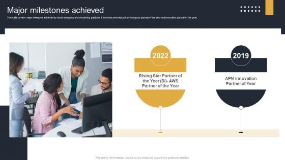 This slide covers major milestone achieved by cloud managing and monitoring platform. It involves awards such as rising star partner of the year and innovation partner of the year. If you are looking for a format to display your unique thoughts, then the professionally designed Major Milestones Achieved Cloud Monitoring And Management Pitch Deck is the one for you. You can use it as a Google Slides template or a PowerPoint template. Incorporate impressive visuals, symbols, images, and other charts. Modify or reorganize the text boxes as you desire. Experiment with shade schemes and font pairings. Alter, share or cooperate with other people on your work. Download Major Milestones Achieved Cloud Monitoring And Management Pitch Deck and find out how to give a successful presentation. Present a perfect display to your team and make your presentation unforgettable. This slide covers major milestone achieved by cloud managing and monitoring platform. It involves awards such as rising star partner of the year and innovation partner of the year.