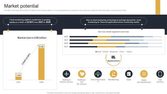 This slide covers market opportunities of investing in cloud monitoring platform. It involves applications such as banking and financial services, healthcare, telecommunication, manufacturing and retail. Are you in need of a template that can accommodate all of your creative concepts This one is crafted professionally and can be altered to fit any style. Use it with Google Slides or PowerPoint. Include striking photographs, symbols, depictions, and other visuals. Fill, move around, or remove text boxes as desired. Test out color palettes and font mixtures. Edit and save your work, or work with colleagues. Download Market Potential Cloud Monitoring And Management Pitch Deck and observe how to make your presentation outstanding. Give an impeccable presentation to your group and make your presentation unforgettable. This slide covers market opportunities of investing in cloud monitoring platform. It involves applications such as banking and financial services, healthcare, telecommunication, manufacturing and retail.