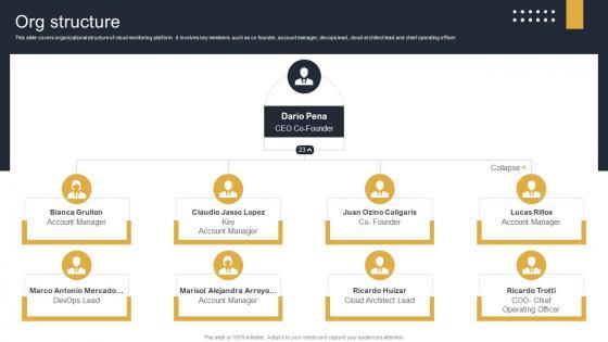 This slide covers organizational structure of cloud monitoring platform . it involves key members such as co founder, account manager, devops lead, cloud architect lead and chief operating officer. Crafting an eye-catching presentation has never been more straightforward. Let your presentation shine with this tasteful yet straightforward Org Structure Cloud Monitoring And Management Pitch Deck template. It offers a minimalistic and classy look that is great for making a statement. The colors have been employed intelligently to add a bit of playfulness while still remaining professional. Construct the ideal Org Structure Cloud Monitoring And Management Pitch Deck that effortlessly grabs the attention of your audience Begin now and be certain to wow your customers. This slide covers organizational structure of cloud monitoring platform . it involves key members such as co founder, account manager, devops lead, cloud architect lead and chief operating officer.