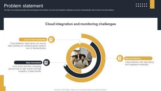 This slide covers problem associated with cloud integration and monitoring. It involves cloud integration challenges such as lack of standardization, data movement and network latency. Formulating a presentation can take up a lot of effort and time, so the content and message should always be the primary focus. The visuals of the PowerPoint can enhance the presenters message, so our Problem Statement Cloud Monitoring And Management Pitch Deck was created to help save time. Instead of worrying about the design, the presenter can concentrate on the message while our designers work on creating the ideal templates for whatever situation is needed. Slidegeeks has experts for everything from amazing designs to valuable content, we have put everything into Problem Statement Cloud Monitoring And Management Pitch Deck. This slide covers problem associated with cloud integration and monitoring. It involves cloud integration challenges such as lack of standardization, data movement and network latency.