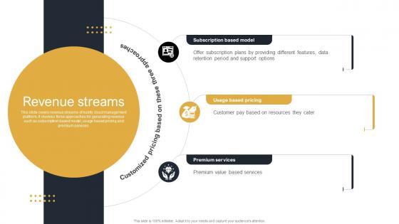 This slide covers revenue streams of nubity cloud management platform. It involves three approaches for generating revenue such as subscription based model, usage based pricing and premium services. This modern and well-arranged Revenue Streams Cloud Monitoring And Management Pitch Deck provides lots of creative possibilities. It is very simple to customize and edit with the Powerpoint Software. Just drag and drop your pictures into the shapes. All facets of this template can be edited with Powerpoint, no extra software is necessary. Add your own material, put your images in the places assigned for them, adjust the colors, and then you can show your slides to the world, with an animated slide included. This slide covers revenue streams of nubity cloud management platform. It involves three approaches for generating revenue such as subscription based model, usage based pricing and premium services.