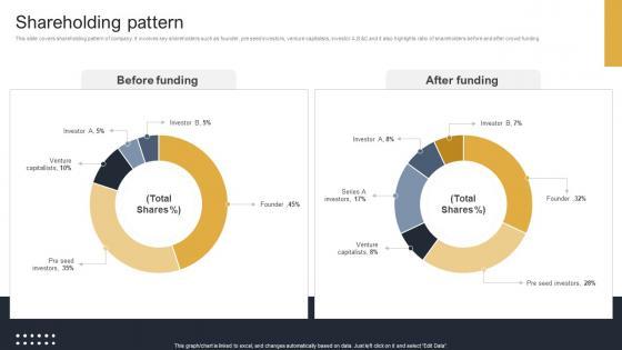 This slide covers shareholding pattern of company. It involves key shareholders such as founder, pre seed investors, venture capitalists, investor A,B andC and it also highlights ratio of shareholders before and after crowd funding. This Shareholding Pattern Cloud Monitoring And Management Pitch Deck is perfect for any presentation, be it in front of clients or colleagues. It is a versatile and stylish solution for organizing your meetings. The Shareholding Pattern Cloud Monitoring And Management Pitch Deck features a modern design for your presentation meetings. The adjustable and customizable slides provide unlimited possibilities for acing up your presentation. Slidegeeks has done all the homework before launching the product for you. So, do not wait, grab the presentation templates today. This slide covers shareholding pattern of company. It involves key shareholders such as founder, pre seed investors, venture capitalists, investor A,B andC and it also highlights ratio of shareholders before and after crowd funding.