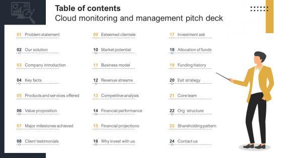 Welcome to our selection of the Table Of Contents Cloud Monitoring And Management Pitch Deck. These are designed to help you showcase your creativity and bring your sphere to life. Planning and Innovation are essential for any business that is just starting out. This collection contains the designs that you need for your everyday presentations. All of our PowerPoints are 100 Percent editable, so you can customize them to suit your needs. This multi-purpose template can be used in various situations. Grab these presentation templates today. Our Table Of Contents Cloud Monitoring And Management Pitch Deck are topically designed to provide an attractive backdrop to any subject. Use them to look like a presentation pro.