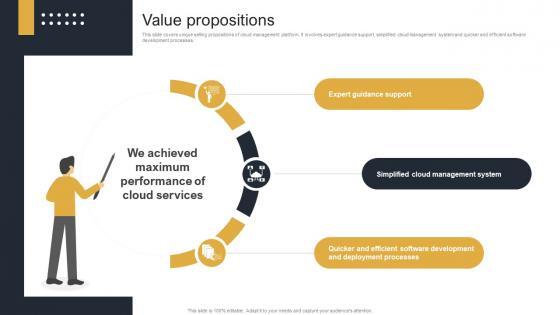 This slide covers unique selling propositions of cloud management platform. It involves expert guidance support, simplified cloud management system and quicker and efficient software development processes. Explore a selection of the finest Value Propositions Cloud Monitoring And Management Pitch Deck here. With a plethora of professionally designed and pre-made slide templates, you can quickly and easily find the right one for your upcoming presentation. You can use our Value Propositions Cloud Monitoring And Management Pitch Deck to effectively convey your message to a wider audience. Slidegeeks has done a lot of research before preparing these presentation templates. The content can be personalized and the slides are highly editable. Grab templates today from Slidegeeks. This slide covers unique selling propositions of cloud management platform. It involves expert guidance support, simplified cloud management system and quicker and efficient software development processes.
