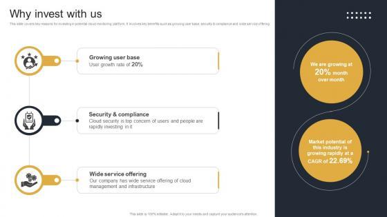This slide covers key reasons for investing in potential cloud monitoring platform. It involves key benefits such as growing user base, security and compliance and wide service offering. The best PPT templates are a great way to save time, energy, and resources. Slidegeeks have 100 percent editable powerpoint slides making them incredibly versatile. With these quality presentation templates, you can create a captivating and memorable presentation by combining visually appealing slides and effectively communicating your message. Download Why Invest With Us Cloud Monitoring And Management Pitch Deck from Slidegeeks and deliver a wonderful presentation. This slide covers key reasons for investing in potential cloud monitoring platform. It involves key benefits such as growing user base, security and compliance and wide service offering.
