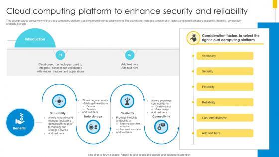 This slide provides an overview of the cloud computing platform used to streamline industrial working. The slide further includes consideration factors and benefits that are scalability, flexibility, connectivity and data storage. This Cloud Computing Platform To Enhance Security And Reliability Optimizing Inventory Management IoT SS V is perfect for any presentation, be it in front of clients or colleagues. It is a versatile and stylish solution for organizing your meetings. The Cloud Computing Platform To Enhance Security And Reliability Optimizing Inventory Management IoT SS V features a modern design for your presentation meetings. The adjustable and customizable slides provide unlimited possibilities for acing up your presentation. Slidegeeks has done all the homework before launching the product for you. So, do not wait, grab the presentation templates today This slide provides an overview of the cloud computing platform used to streamline industrial working. The slide further includes consideration factors and benefits that are scalability, flexibility, connectivity and data storage.