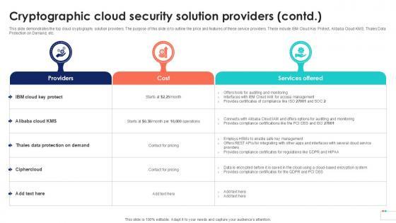 This slide demonstrates the top cloud cryptography solution providers. The purpose of this slide is to outline the price and features of these service providers. These include Amazon Web Services Key Management Service AWS KMS, Microsoft Azure Key Vault, Google Cloud KMS, etc. Coming up with a presentation necessitates that the majority of the effort goes into the content and the message you intend to convey. The visuals of a PowerPoint presentation can only be effective if it supplements and supports the story that is being told. Keeping this in mind our experts created Cryptographic Cloud Security Solution Data Security In Cloud Computing Ppt Template to reduce the time that goes into designing the presentation. This way, you can concentrate on the message while our designers take care of providing you with the right template for the situation. This slide demonstrates the top cloud cryptography solution providers. The purpose of this slide is to outline the price and features of these service providers. These include Amazon Web Services Key Management Service AWS KMS, Microsoft Azure Key Vault, Google Cloud KMS, etc.