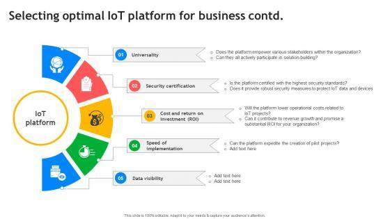 This slide discusses selecting best IoT platform for an organization that is most suitable. The purpose of this slide is to highlight the factors to be considered for optimal selection of IoT platform which include development stage consideration and industry understanding. From laying roadmaps to briefing everything in detail, our templates are perfect for you. You can set the stage with your presentation slides. All you have to do is download these easy to edit and customizable templates. Steps To Select Optimal IoT Platform Exploring Google Cloud IoT Platform will help you deliver an outstanding performance that everyone would remember and praise you for. Do download this presentation today. This slide discusses selecting best IoT platform for an organization that is most suitable. The purpose of this slide is to highlight the factors to be considered for optimal selection of IoT platform which include development stage consideration and industry understanding.