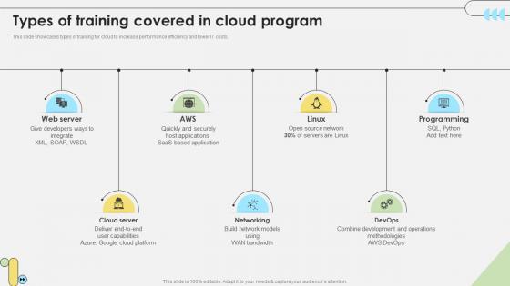 This slide showcases types of training for cloud to increase performance efficiency and lower IT costs. Presenting this PowerPoint presentation, titled Workforce Competency Enhancement Types Of Training Covered In Cloud Program DTE SS V, with topics curated by our researchers after extensive research. This editable presentation is available for immediate download and provides attractive features when used. Download now and captivate your audience. Presenting this Workforce Competency Enhancement Types Of Training Covered In Cloud Program DTE SS V. Our researchers have carefully researched and created these slides with all aspects taken into consideration. This is a completely customizable Workforce Competency Enhancement Types Of Training Covered In Cloud Program DTE SS V that is available for immediate downloading. Download now and make an impact on your audience. Highlight the attractive features available with our PPTs. This slide showcases types of training for cloud to increase performance efficiency and lower IT costs.