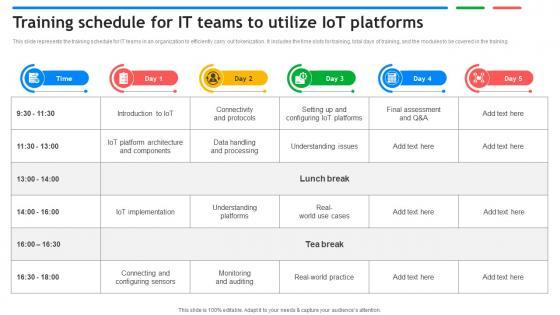 This slide represents the training schedule for IT teams in an organization to efficiently carry out tokenization. It includes the time slots for training, total days of training, and the modules to be covered in the training. Do you have an important presentation coming up Are you looking for something that will make your presentation stand out from the rest Look no further than Training Schedule For It Teams To Utilize IoT Platforms Exploring Google Cloud IoT Platform With our professional designs, you can trust that your presentation will pop and make delivering it a smooth process. And with Slidegeeks, you can trust that your presentation will be unique and memorable. So why wait Grab Training Schedule For It Teams To Utilize IoT Platforms Exploring Google Cloud IoT Platform today and make your presentation stand out from the rest This slide represents the training schedule for IT teams in an organization to efficiently carry out tokenization. It includes the time slots for training, total days of training, and the modules to be covered in the training.