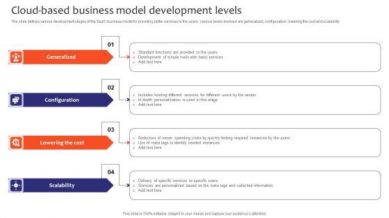 The slide defines various development stages of the SaaS business model for providing better services to the users. Various levels involved are generalized, configuration, lowering the cost and scalability. Persuade your audience using this Cloud Based Business Model Development Levels Clipart PDF. This PPT design covers four stages, thus making it a great tool to use. It also caters to a variety of topics including Generalized, Configuration, Lowering The Cost, Scalability . Download this PPT design now to present a convincing pitch that not only emphasizes the topic but also showcases your presentation skills.